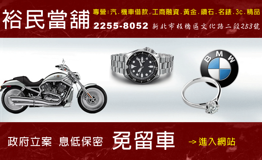 專辦機車借款,不限車齡,不限車種,可超貸兩倍免留車,黃金鑽石名錶借貸,貸款機車可借,可彈性還款,讓你的機車幫你轉現金,不限車齡分期車可借,裕民公會認證優質首選,解決各行各業在資金週轉上的煩惱,借款手續簡單低利放送輕鬆還,歡迎來店免費鑑車,滿意額度再借。相關站點:昱利股票代墊款.台北市京華當舖汽機車借款.台北市萬華萬事達當舖